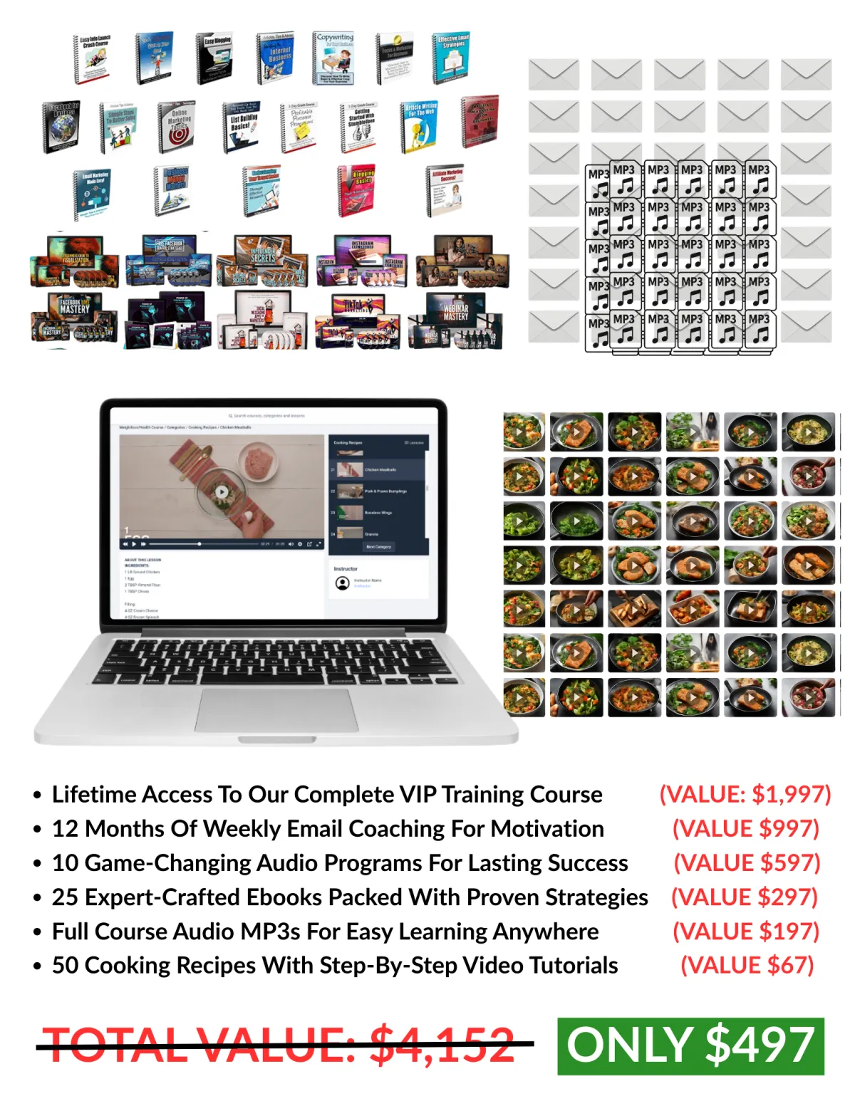 When you join, you’re getting lifetime access to our complete training course, weekly email coaching for ongoing support, powerful audio programs, expert-crafted ebooks, and 50 delicious recipes with step-by-step tutorial videos that also include the nutritional value of each — everything you need to stay on track with your diet and achieve lasting results.